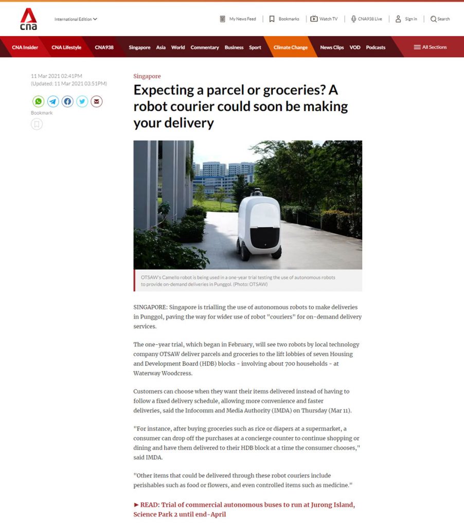 亞洲新聞臺 (Channel News Asia) 特寫報道了 Activ OTSAW 的 Camello 最后一英里配送機(jī)器人在榜鵝 (Punggol) 的水路田園 (Waterway Woodcress) 的一年試用情況,該區(qū)域涉及 700 個住戶。